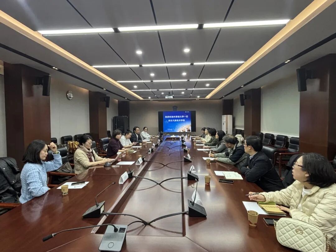 调研团队与两所院校相关领导、骨干教师围绕核心议题座谈交流。马兰州介绍了学院获批的中美合作数字媒体艺术专业本科项目,该项目依托学校多语种、多学科优势,旨在培养国际化数智媒体人才。天津理工大学项目负责人详解了中加合作动画专业的成熟培养模式及全流程实验教学体系,天津美术学院项目负责人分享了中英合作办学项目的整体规划与实践经验,双方就生源优化、外教授课、学分互认等关键问题深入研讨,交换发展见解。