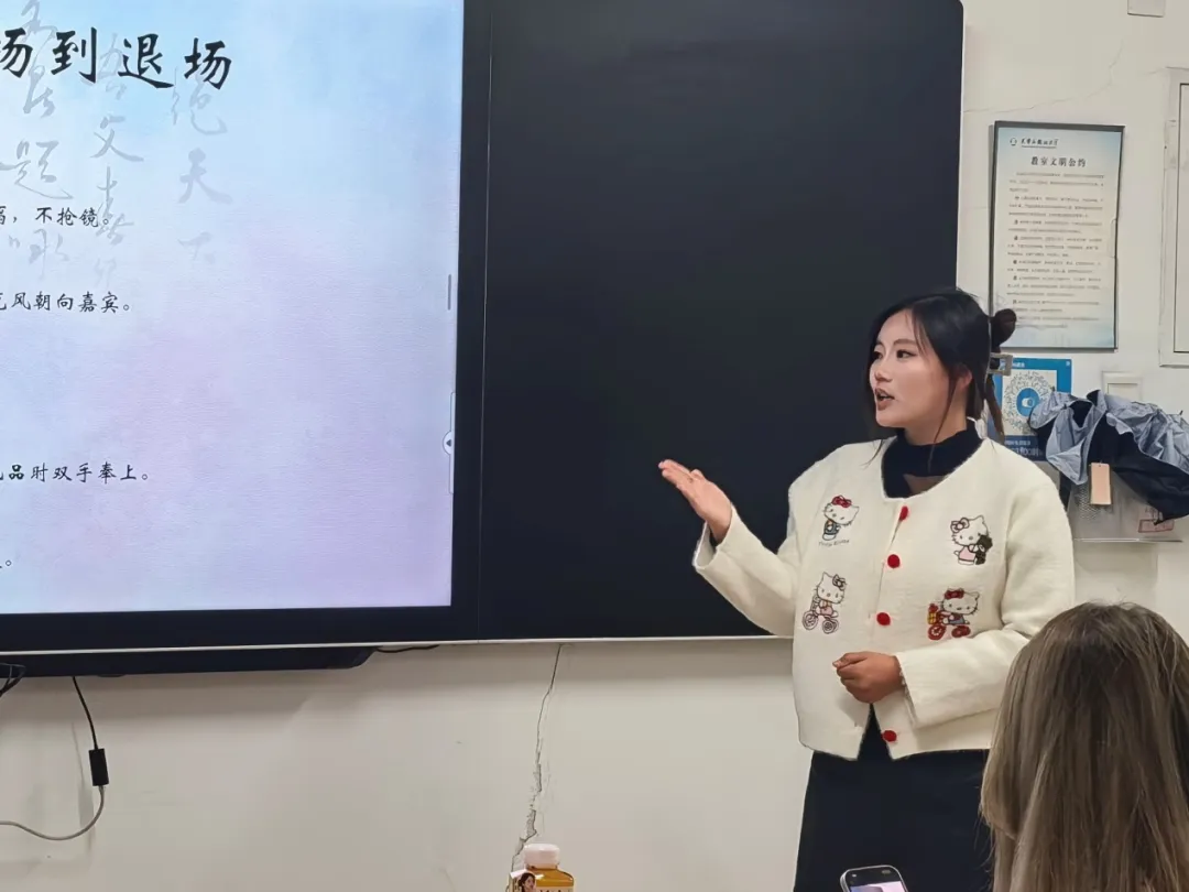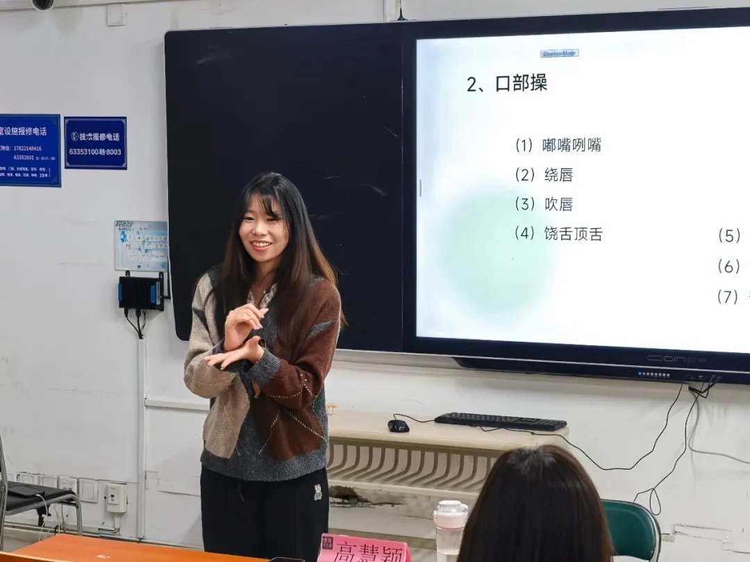 王召婕强调了主持人的基本素养,聚焦在礼仪、谈吐、服饰和妆造的重要性上,她提到“每场主持都要针对其场合的性质进行调整,要与其适配”,同时点明了舞台状态对主持效果的加持。最后,她鼓励同学们以满腔热情拥抱声音的蓝天。