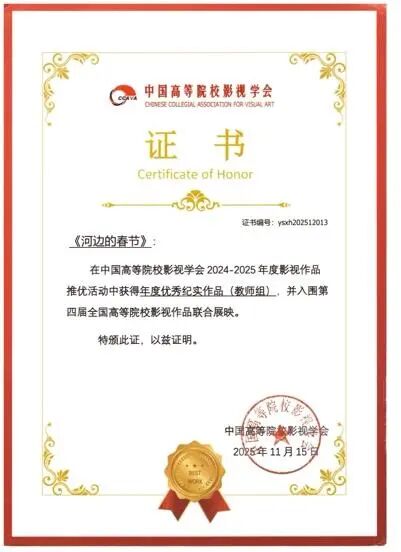 2025年11月15日,中国高等院校影视学会第二十五届年会暨第十八届中国高校影视学术论坛在厦门大学隆重举行。本届年会由中国高等院校影视学会与厦门大学联合主办,汇聚了来自北京大学、清华大学、复旦大学等国内高校及保加利亚国立艺术学院等海外院校的750余位专家学者。与会代表围绕"新征程 新使命:中国影视与文化强国建设"主题展开深入交流。在年会的重要环节——2024—2025年度影视作品推优活动评选结果揭晓,在报名的1975部作品中,我校国际传媒学院王佳音教师带领团队创作的纪录片《河边的春节》脱颖而出荣获"年度优秀纪实作品(教师组)"奖,并成功入围第四届全国高等院校影视作品联合展映。