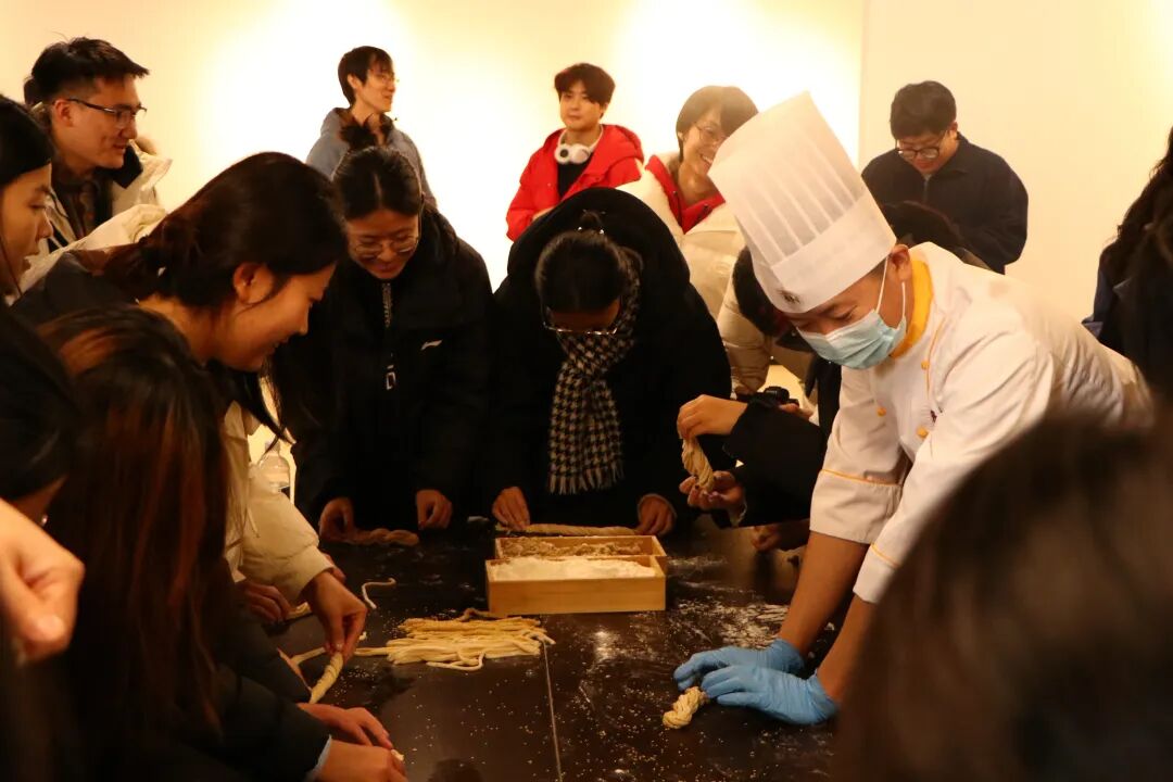 在核心体验环节,同学们在传承人的专业指导下参与手工制作“十八街麻花”。从原料甄选、工序拆解到动手实操,大家在一揉一搓、一描一绘的细致操作中,体悟传统技艺的精妙严谨与手工艺人“择一事、终一生”的匠心坚守。现场互动氛围热烈,理论认知与实践体验深度融合,让非遗文化变得可触可感、可亲可学,进一步加深了学生对津派文化的认同与热爱。