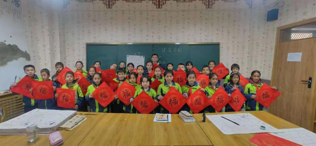 书法课程教学步入正轨。课前我常提前到书法教室给每一位孩子写一个示范字,并在课堂上发到他们手中。从清水润笔,到饱蘸浓墨,从挤墨调锋,到平心静气,我从最基本的常识开始解释,以便同学们都能找到适合自己的节奏。在孩子们眼里,支教团成员有一个共同的名字——“天津老师”,我就以“天”字为例,介绍“横”“撇”“捺”三个笔画的书写要义,并将纸张固定在黑板上,一笔一划带领同学们书写。在下台巡视的时候,孩子们书写的水平也参差不齐,有的已经能比较准确地把握字形结构,写出一种古朴端庄的“挺拔感”,也还有同学横画写不直,撇画少力度,捺画撑不住。